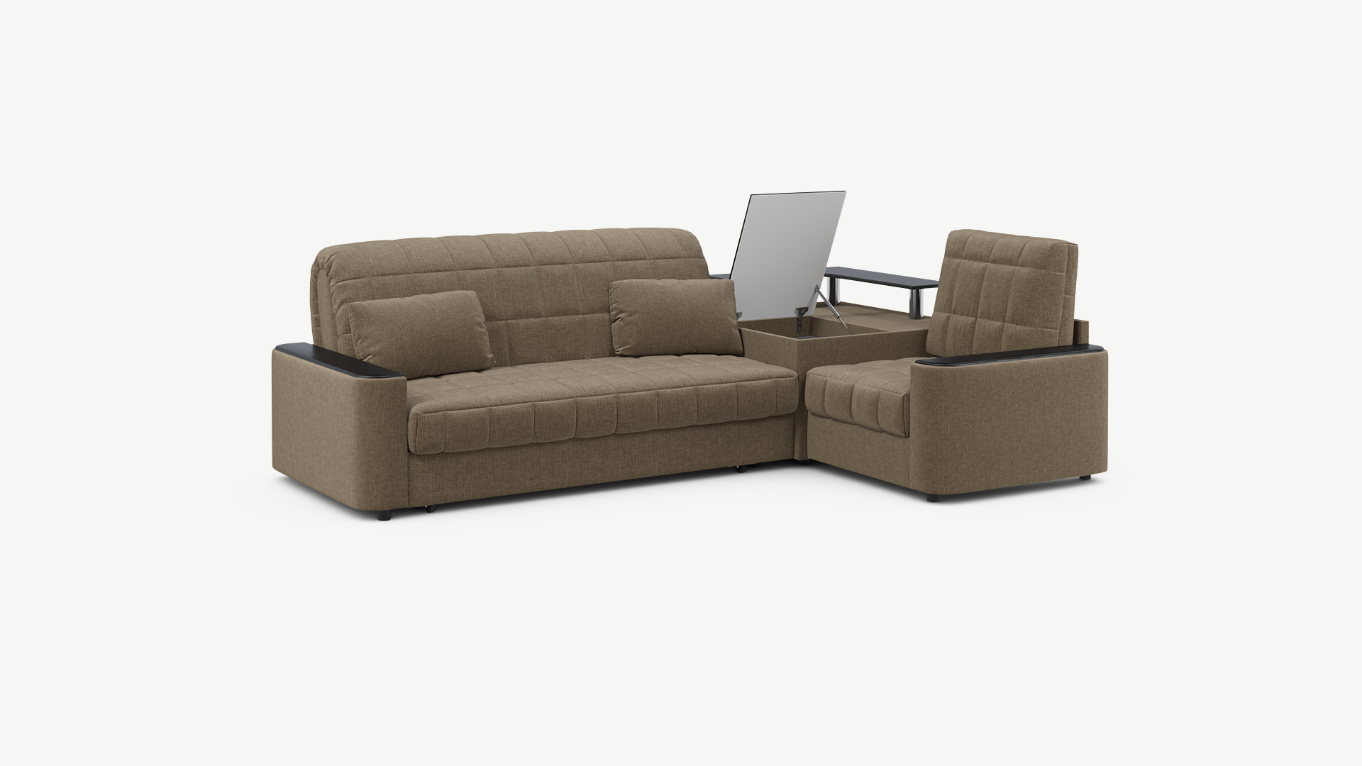 Выбирая угловой диван со столиком, Вы сможете проводить время с максимальным комфортом, многократно повысив функциональность дивана. Все дело в том, что под столешницей модуля расположена вместительная емкость для хранения. Кроме того, поверхность столика — идеальное пространство для чаепития в приятной компании, а также место для множества актуальных мелочей — от ноутбука до косметики.