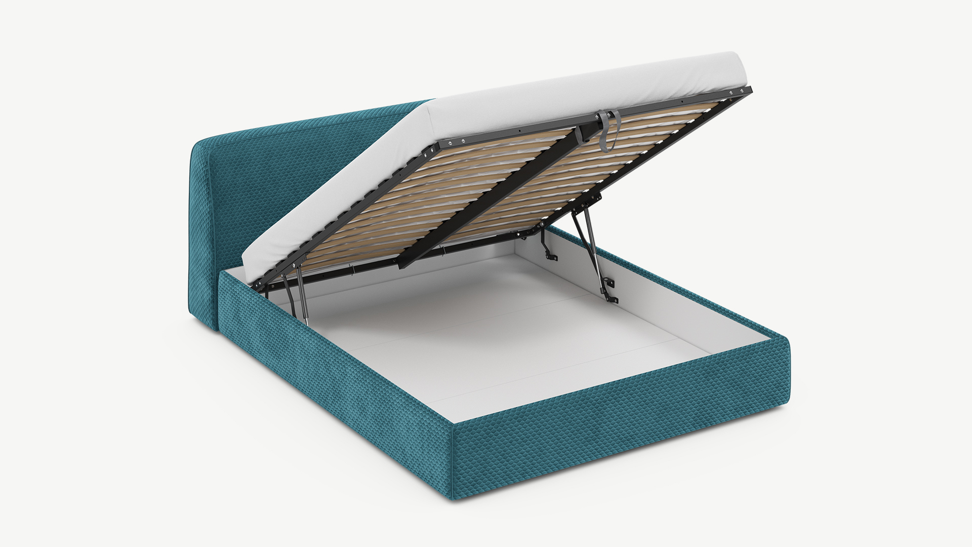 Вместительная емкость под кроватью без внутренних перегородок позволяет использовать для хранения вещей 100% пространства.