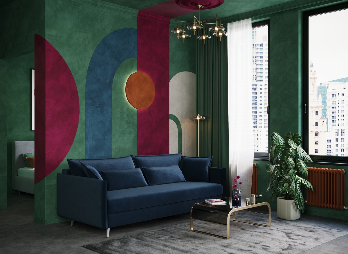 Спинка, выполненная в обивочной ткани, позволяет использовать диван для зонирования пространства.
